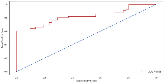 The application of the SVM classifier in the leak location process for the zones was adapted to provide possible leak locations within the water distribution pipeline. This can occur in several locations, and the magnitudes of such leaks are 30, 35, 40, and 45 L/s for each node. The effect of uncertainty conditions when modeling the network on EPANET was also considered; these uncertainty conditions, which correspond to [−4, 5] of the network, such as the demand and noise level uncertainty, also contributed to the overall performance of the classifier. Furthermore, the receiver operating curve (ROC) (Figure 7) indicates that the model has an area under the curve (AUC) of 0.821, which indicates the model’s excellent performance in leak detection and localization using the simulated dataset.