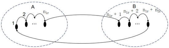 Here, the seaport inside the dashed circle is situated on the opposite side of the intercontinental route. The ports linked by the dashed line do not engage in goods exchange. On the route, assuming there are n1r ports at the starting point A and n2r ports at the ending point B, there are (n1r + n2r) segments in total on the route r. The relationship between freight volume and container transportation demand on each section of the route r can be represented as follows: