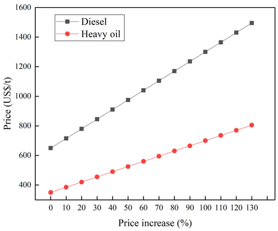 Based on the ship allocation results of the route, this paper analyzes fuel sensitivity. Taking the second type of ship configured in route 1 as the research object, under the assumption that the fluctuation range of diesel and heavy oil prices is both 10%, the fuel sensitivity change is shown in Figure 3. The influence of fuel price on shipping factors is shown in Figure 4.