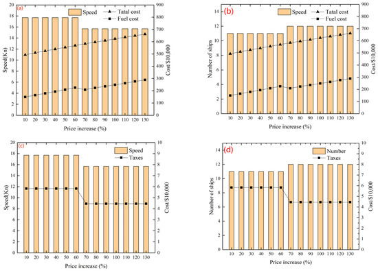 Figure 4a,b clearly indicate that as fuel prices rise, the optimal speed of liner shipping remains consistent, though there is a noticeable slowdown trend. Additionally, while the optimal number of ships remains stable, there is a general upward trend. Furthermore, when the optimal speed and number of ships are held constant, the fuel cost increases correspondingly with the rise in fuel prices. It is noteworthy that, at the point where the optimal speed begins to decrease while the optimal number of ships starts to rise, the increase in fuel prices actually results in a decrease in fuel costs.