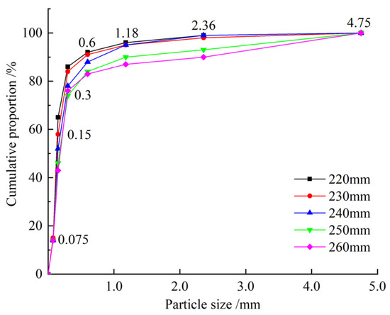 The gangue grouting backfilling material was made by mixing and stirring crushed gangue with water, and no additives were added. The gangue used in the experiment was taken from the washing gangue generated during the mining process of a certain coal mine. To ensure the good conveying performance of the gangue slurry, the fluidity should be controlled between 220 and 260 mm [29]. Under the constant mass concentration (70%) of the slurries, five slurries with different fluidities were obtained by adjusting the particle size grading of the aggregates. Figure 1 shows the particle size grading of the gangue. The characteristic particle size parameters of the gangue with different fluidities were calculated from Figure 1, including the controlled particle size (d10, d30 and d60), non–uniformity coefficient (Cu), and curvature coefficient (Cc), as shown in Table 1.
