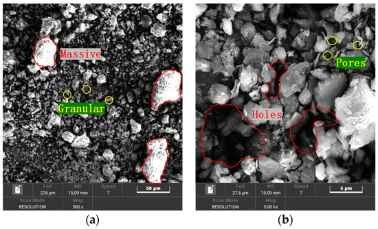 Figure 2. SEM results of gangue materials: (a) 500×, (b) 5000×.