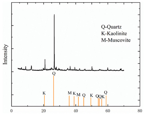The X-ray diffraction (XRD) spectrum of the gangue material is shown in Figure 3. By comparing it with the international powder diffraction database, it can be obtained that the main mineral composition of the gangue is quartz (quartz, the main component of sandstone), kaolinite (kaolinite, an important component of mudstone), and muscovite (muscovite, an important component of mudstone). Therefore, the gangue used in the experiment is mainly composed of sandstone and mudstone.