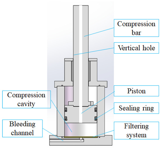 A loading simulation system of grouting backfilling materials was developed to simulate the bleeding and bearing characteristics of the gangue slurry after loading on the overburden in the backfilling area, as shown in Figure 4. The system mainly includes a pressure structure, a filtering structure, and a bleeding structure. ① Pressure structure. This structure includes a pressure rod, vertical hole, piston, sealing ring, and compression chamber. The pressure rod and the piston arranged with a sealing ring transmit the pressure of the universal testing machine to the slurry inside the compression chamber, playing a role in pressurization. The vertical holes inside the compression rod are used to inject the slurry into the compressed slurry. ② Filtering structure. This structure includes a stainless steel mesh with a pore size of 0.1–1 mm in the upper layer, a screen cloth of 18–25 μm in the middle layer, and a screen plate with a thickness of 2 mm, a hole diameter of 2 mm, and a hole spacing of 2 mm in the lower layer. During the compression process, water in the slurry can be secreted and the loss of solid particles can be prevented. ③ Bleeding structure. The bottom of the system is arranged with a bleeding channel to guide the bleeding water to the weighing device. The loading simulation system of grouting backfilling materials has an inner diameter of 130 mm, a height of 200 mm, a piston thickness of 50 mm, an effective inner cavity height of 150 mm, and a maximum pressure resistance value of 32 MPa. The hardness and stiffness of the cylinder wall of the loading simulation system of grouting backfilling materials are large and the wear resistance is strong. Therefore, the radial and lateral deformation in the test can be ignored. The WAW–2000D universal testing machine serves as a testing loading device, with servo control and automatic data acquisition functions. The axial pressure range is 0.02–2000 kN, and the loading rate range is 0.002–20 kN/s.