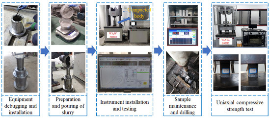 The bearing deformation characteristics of gangue slurry were obtained by uniaxial confined compression tests on the gangue slurry loaded into the loading simulation system through the WAW–2000D universal testing machine. In the later stage of mechanical strength testing, the WAW–1000 universal testing machine was used to conduct uniaxial compressive strength tests on the compacted body. Figure 5 shows the testing steps.