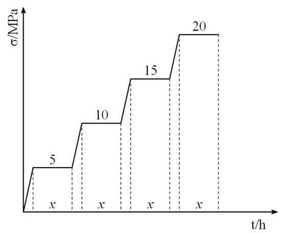 In the experiment, a graded loading method was adopted at four levels of 5, 10, 15, and 20 MPa. The loading duration of each level was about 1000 s, and the loading duration was set as x. The creep loading method was achieved and data were recorded. Figure 6 shows the loading method and Table 2 shows the test plan.