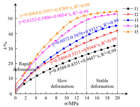 Rapid deformation stage (0–4 MPa). The compression rate increases rapidly with the increase of stress, and the deformation generated in this stage accounts for about 45% of the total deformation. In the initial loading stage, the slurry has large pores and poor stability, and the contact area and compression degree of gangue particles are small, exhibiting characteristics of rapid deformation and poor bearing performance. At this stage, the compression rate–stress curves of I4 and I5 almost overlap, and the degree of bearing deformation of the slurry is less affected by the fluidity.