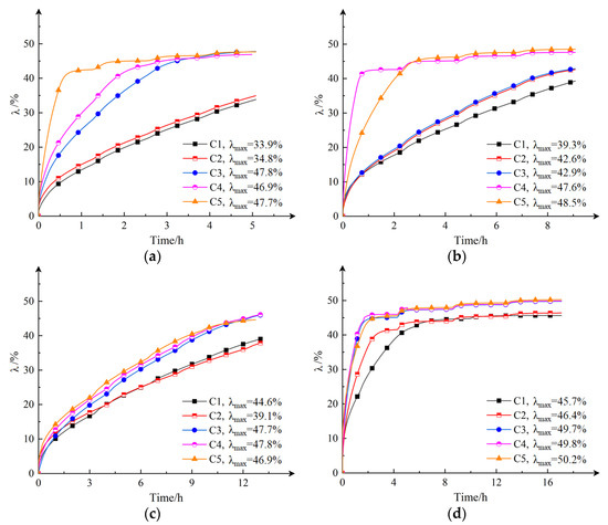 Figure 8. Strain–time curve of gangue slurry with different fluidities under the creep compression test: (a) x = 1, (b) x = 2, (c) x = 3, (d) x = 4.