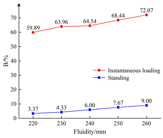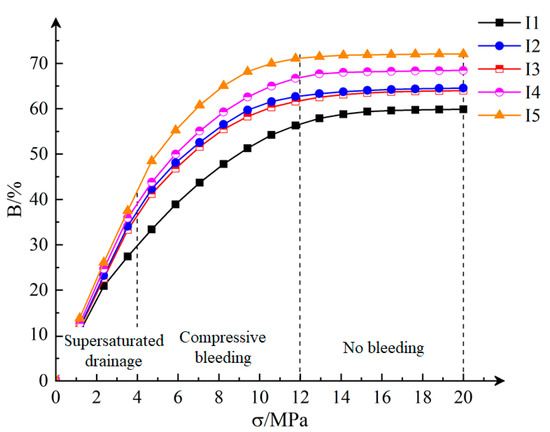 As shown in Figure 9, the static bleeding rate and compressive bleeding rate of the gangue slurry are positively correlated with fluidity. The bleeding rate of the slurry is low in a static state, only 3.37–9.00%. The moisture in the slurry can maintain its good conveying performance. The bleeding rate of the slurry after loading increases significantly, reaching 59.89–72.07%. Specifically, I1–I5 slurries increase by 56.52%, 59.63%, 58.54%, 50.77%, and 72.07%, respectively. When the stress reaches 20 Mpa, the water content in the slurry is less than 45%, and the water remaining in the slurry and gangue particles form a high solid–water ratio compacted body, which plays a bearing role under the loading of overburden.