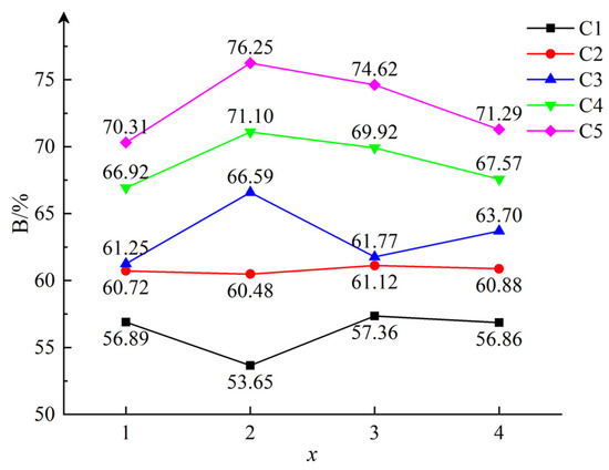 • As x increases, the grouping differences in compression rates between slurries with different fluidities gradually weaken over time. When x = 1, the compression rates of C1–C2 and C4–C5 remain significantly different, and C1–C2 does not reach a stable stage when loaded to 20 MPa. When x = 2 and 3, the difference in compression rates between C1–C2 and C4–C5 gradually decreases. When x = 4, the difference in compression rates between C1–C2 and C4–C5 further decreases, and compression rates of C1–C5 have reached a stable stage when loaded to 20 Mpa. Under different loading schemes, the extreme variation of the compression rate of C3 is relatively small, and the trend of variation over time is relatively stable. This indicates that the gangue slurry has good bearing performance and deformation resistance when the fluidity is 240 mm.