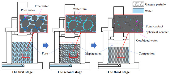 The extraction of coal resources is often accompanied by the generation of solid waste products such as coal gangue, which brings many challenges to society and the environment. The large–scale discharge of gangue results in a range of issues, including land resource occupation, human health hazards, and surface desertification [1,2,3,4,5]. Furthermore, the movement and fracturing of overburden after coal mining leads to surface deformation and damage to buildings [6,7,8,9,10]. The disposal of gangue and control of surface deformation have become increasingly difficult problems in the protection of the mining ecological environment. In the gangue grouting backfilling technique [11], the backfilling slurry is prepared by mixing the gangue with different particle sizes and water at different ratios, and then transported to the underground backfilling area by filling equipment and pipelines. The distinguishing feature of this technique lies in the absence of additives in the backfilling slurry. The backfilling area includes the caving zone, fracture zone, and separation zone formed after coal mining. The backfilling effect is mainly affected by the bearing characteristics of the slurry. The on–site application research of the grouting backfilling technique shows [12] that the backfilling material flows in the form of slurry in the area during the grouting process; as the overburden slowly sinks, the water in the slurry continuously bleeds under pressure, ultimately forming a compacted body with certain strength. In this case, the compacted body remains in the backfilling area and plays a role in controlling surface deformation. The compression deformation and water bleeding of the slurry under pressure directly affect the effectiveness of the grouting backfilling technique in controlling the surface. Therefore, studying the bearing mechanism and mechanical properties of backfilling materials underground is of great significance.