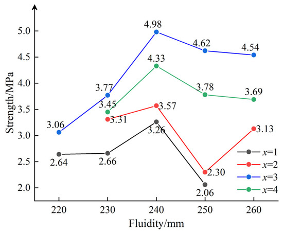 As shown in Figure 1, the main factor affecting the fluidity of gangue slurry is the proportion of coarse and fine particle sizes. The smaller the proportion of fine particle sizes, the greater the fluidity of the slurry. According to Table 1, the particle size grading of gangue with different fluidities is relatively uniform, and the gradation continuity is good.