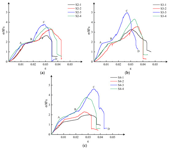 Figure 14. Stress–strain curves of compacted solid with different fluidities: (a) 230 mm, (b) 240 mm, (c) 250 mm.