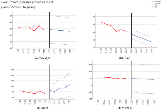 Figure 3 shows the optimized ARIMA models for each classification. The optimized forecasting model from several ARIMA models is provided in Table 2. The main trend is that Wood_S, Conc, and Metal_ will decline, but the rest will increase. Overall, offsite (PCCs) has a declining trend, but onsite has a somehow steady trend of accident frequency. However, with a shift to more offsite construction, there is the possibility of more accidents being reported where Alum, Metal_P, and Wood_P will more critical.