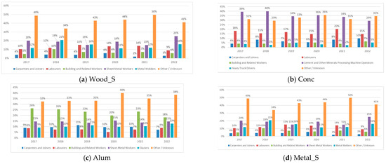 Figure 5 shows the most common vulnerable occupation for each type of PCC. The X-axis represents the years, and the y-axis represents the percentages of occurrence. It is to be noted that three occupations are similar in all types, such as ‘carpenters and joiners’, ‘labourers’, and ‘building and related workers’, but the nature of work varies for each. However, there is an occupational category called ‘other/unknown’, which has not been associated with any services. Conc has more accidents reported under this category. This demonstrates that there is less clarity around the professional engagement of employees in PCC. Employees under ‘carpenters and joiners’ and ‘labourers’ are more vulnerable for Wood_S in comparison to the rest of the types of PCC. However, it is different for ‘building and related workers’, where most accidents happened in Conc. Other top vulnerable occupations in each PCC type are ‘Cabinet Makers and Related Workers’ (Wood_S) with 37%, ‘Cement and other Minerals Processing’ (Conc) with 35%, ‘Sheet metal workers’ (Metal_S-14%, Metal_S-19%, and Metal_P-10%), and ‘Painters and paperhangers’ (Wood_P) with 4% in specific categories. Accidents reported for ‘carpenters and joiners’ in all types of PCC are behind by 833 compared to companies providing carpentry services only (42420). However, in comparison to house construction companies (41110) involved on-site, the PCC represents only 7% of accidents. Nevertheless, regardless of offsite or onsite status, ‘carpenters and joiners’ are most vulnerable. On the other hand, ‘labourers’ working in PCC face almost half the accidents in comparison to house construction companies, but employees under ‘building and related workers’, showed a similar number of accidents.