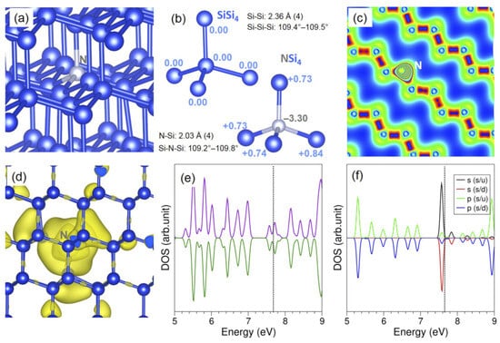 (a) The Ns in the Si lattice; (b) tetrahedral units comparing Bader charges, bond distances, and angles; (c) charge density; (d) band-decomposed charge density plot for Ns; (e) total DOS, and (f) atomic DOS plot of N [54].