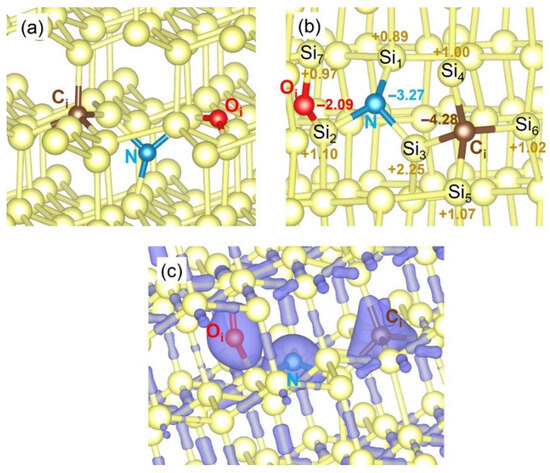 The structures N-C and N-C-O have been recently investigated using DFT calculations [57]. The DFT results by Kuganathan et al. [57] showed that in the relaxed structure of the CiN defect, nitrogen is in a distorted trigonal planar configuration with the nearest neighbor silicon atoms (refer to Figure 9a). The Si-N bond distances are 1.74–1.80 Å and are shorter as compared to the Si-Si bond distance (2.37 Å) in the undoped Si lattice [57]. The key is the higher electronegativity of N as compared to Si, which also impacts the Bader charges [57]. In particular, N has accumulated a high negative Bader charge (–3.21) with the nearest neighbor Si atoms having a positive Bader charge (refer to Figure 9b) [57]. Considering the Ci is tetrahedrally coordinated and has four nearest neighbor Si atoms [57]. The shorter Si-C bond distances (1.92–2.02 Å) as compared to the Si-Si bond distance and the negative Bader charge on the C atom reflect the electronegativity difference between the C and Si atoms (refer to Figure 9c) [57].