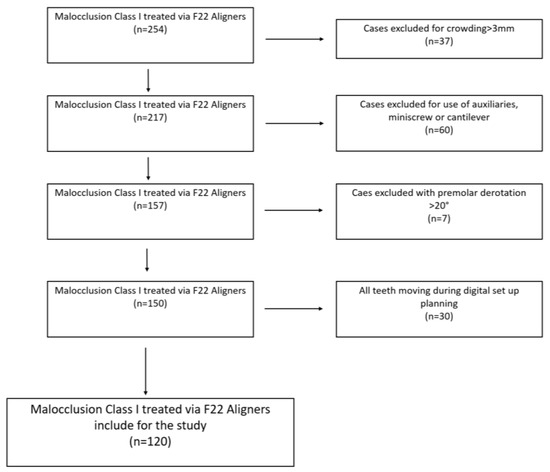 This retrospective selection resulted in a final sample of 120 patients (64 female and 56 male; mean age 35.2 years ± 7.4), starting from 254 cases affected by dental Class I Malocclusion treated via F22 Aligners. A flow chart of retrospective sample selection is graphically illustrated in Figure 1.