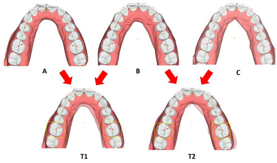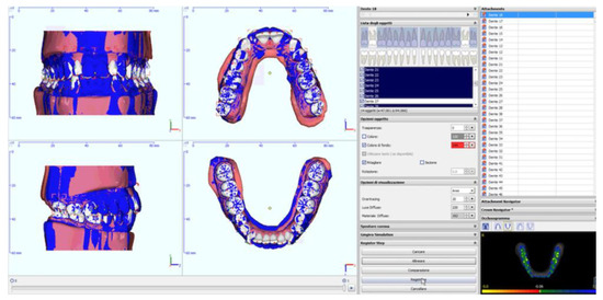 For each patient, maxillary and mandibular models of the initial malocclusion (pre-treatment model), of the final step of digital planning (reference model) and of the end of the initial prescribed series of aligners (pre-finishing model) were acquired in STL format using the appropriate setup software. Thus, a total of 720 models were investigated. Each model was imported into Onyxceph 3TM software (Firma Image Instruments GmbH, Chemnitz, Germany) in order to perform the various digital superimpositions at the reference unmoved first and/or second molars in each quadrant (Figure 2) [14,34].