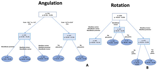 Graphical representation of CHAID regression trees investigating the accuracy of tooth movement achieved for angulation (A) and rotation (B) with respect to the amount of prescribed movements, tooth type (incisors, canines, premolars and molars) and presence/absence of grip points (yes or no). All splits were identified with significance thresholds set at 0.05. n = number of observations; Y = average accuracy.