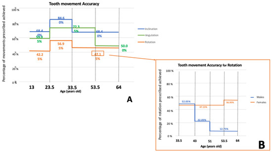 Graphical representation of percentage of movements prescribed achieved for inclination, angulation and rotation, considering age variable (A,B). (B) Represents the percentage of rotation movements achieved between 33.5 and 64 years of age where both sex and age have an influence.