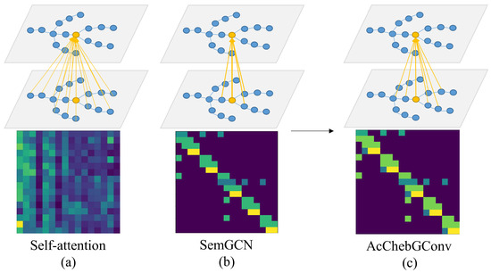 The SGraAttention module is equipped with two residual connections [49], primarily comprising a multi-head self-attention mechanism and two layers of semantic graph convolution, along with a LayerNorm (LN) layer [50] and a dropout layer [51]. As illustrated in Figure 2, the 17 joints undergo pre-encoding in the Chebyshev graph convolution layer before being fed into the SGraAttention module. The input feature vectors are initially normalized by the LayerNorm (LN) layer [50] and subsequently passed through the multi-head self-attention layer. The multi-head self-attention module employed here corresponds to the traditional Transformer [41] architecture. Initially, global feature information is extracted through the self-attention mechanism, as depicted in Figure 3a, aiding the model in comprehending contextual relationships among human joint points.
