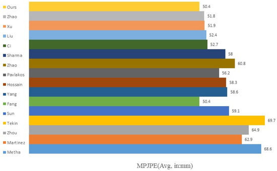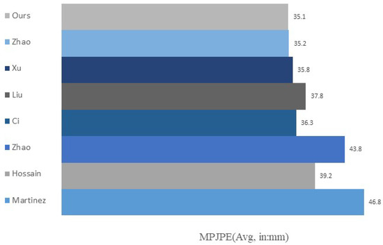 Among the aforementioned studies, some [12,13,14,15,18] have adopted an end-to-end approach that takes images as input. However, these approaches have yielded unsatisfactory estimation results primarily due to the limited feature information available in the images. When confronted with occlusion issues, these models, which rely solely on a single view, struggle to accurately infer hidden features. Furthermore, these models exhibit heightened sensitivity to various factors, such as background and lighting conditions, which contributes to reduced model robustness and generalization. In contrast, leveraging the two-dimensional skeleton provides access to a wealth of spatial kinematic information [28,37], enabling the exclusion of extraneous image features during model training. As depicted in Table 1, all of these models utilize the output from the cascaded pyramid network (CPN) [21] as their input. Notably, among the 15 actions assessed in the Human3.6M [30,31] dataset, our approach achieves the lowest overall prediction error for nine actions and excels in scenarios involving occluded frames, such as greeting, phoning, and sitting. The average error across all actions experiences a substantial reduction of nearly one and a half points compared to the most recent work [28]. The bar chart is shown in Figure 5. These results demonstrate the superior performance of our method in comparison to state-of-the-art techniques, with the exception of action poses. Furthermore, when compared to other methods [26,27,53] that employ graph convolution, our approach consistently delivers superior results for almost all actions.