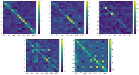 Visualization of the learnable adjacency matrix used in the five-layer LAM graph convolution, with the lowercase letters indicating the results for visualization of the corresponding layer.