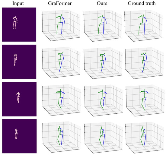 Visual comparison of some occluded frames between GraFormer [28] and our model in the test set of Human3.6M [30,31].