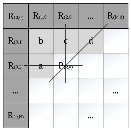 Edges are the intersection of different image attributes. The value differences between image samples located at both ends of edges are significant. Since images generally contain a large number of different attributes, the occurrence frequency of edges is very high. In conventional intra-prediction, all samples in a prediction block share the same predictor. However, in a prediction block, samples located at edges in different directions are suitable for different predictors. To improve this situation, a gradient edge detection (GED) algorithm is proposed. GED detects edges near the current sample by analyzing gradient information between adjacent reference samples. Then, GED selects the optimal predictor for the current sample based on the result of edge detection. The prediction process of GED and the positional relationship between the reference samples and the current sample are shown in Figure 3. In order to use reference sample d in the prediction process, the prediction has to be performed line-by-line. In the absence of reference sample d, the closest sample is used to populate it.