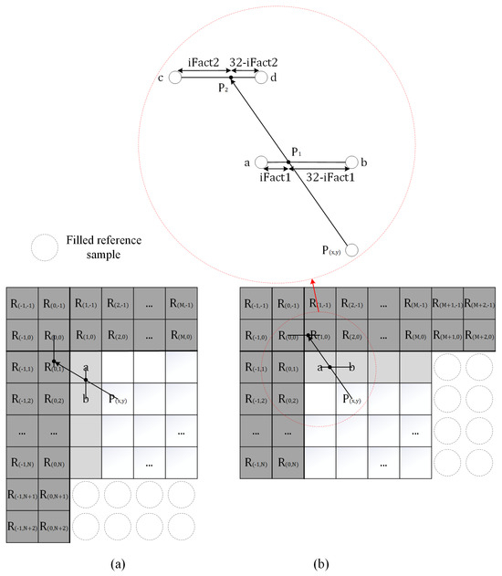 The trend of changes between image samples has continuity. There is a correlation between the difference between the current sample and and the difference between and . Type 1 uses the difference between and to compensate for to obtain the prediction sample, which expands the scope of application of angular prediction. Type 2 uses the average value of and to generate the prediction sample: