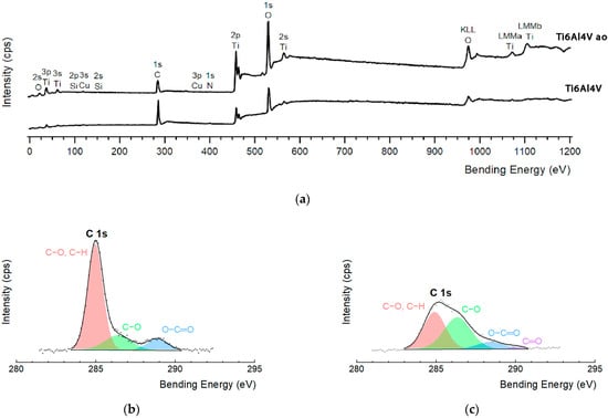 X-ray photoelectron spectroscopy (XPS) was used to measure the elements, chemical states, and their interactions. The complete range of Ti6Al4V alloy samples, both before and after the growth of a nanotube layer, is shown in Figure 7a. The results of the deconvolution can be found in Table 1. The main elements observed in both cases were titanium (Ti), oxygen (O), and carbon (C), with trace amounts of nitrogen (N), silicon (Si), and copper (Cu) also detected. These lower levels are likely related to surface contamination that occurred during sample processing and preparation. Two peaks indexed to Ti6Al4V were identified (Figure 7d,e): Ti 2p 1/2 and Ti 2p 3/2. Deconvolution analysis revealed the presence of Ti in the oxidation states of Ti3+ (458.6 eV and 463.8 eV) and Ti4+ (460.0 eV and 465.5 eV). These states are associated, respectively, with Ti2O3 and TiO2 oxides that are formed during the anodization process [25,26,27].Deconvolution of the O 1s peak resulted in three components (Figure 7f,g): O2− (529.5 eV), which is present in the formation of oxides with Ti; hydroxyl groups (-OH) (531.9 eV); and adsorbed water molecules (533.6 eV) on the surface [25,26]. Its deconvolution (Figure 7b,c) revealed peaks at 284.6 eV (C-C, C-H), 286.6 eV (C-O), and 288.6 eV (O-C=O). After the growth of TiO2 nanotubes, a fourth component at 290.0 eV (C=O) was observed [25,27]. The carbon present on the surface originated from contamination, as verified in other studies involving anodic oxidation. No interference with cell adhesion and proliferation was observed [28]. According to the literature, analyzing samples without carbon carbonates that can be deposited on the surface of TiO2 in a few seconds is a significant challenge [29].