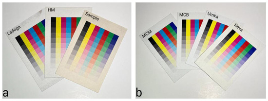 To assess the quality of printing, test charts were printed on the recycled paperboards (Figure 1) using a Mimaki UJF-3042 MkII inkjet flatbed printer (Nagano, Japan) with UV curing technology. The tristimulus values on the test charts were determined towards a white standard under the following conditions: D50 standard illuminant; standard observer, 2°; instrument geometry, 0/45°. The color gamuts were visualized as hexagon areas on a* and b* axes of the chromaticity diagram of the CIE La*b* colorimetric system, where L is lightness (L = 0—absolute black, and L = 100—reference white), the a* and b* coordinates characterize saturation and hue, respectively. The a* axis is represented by values from −120 to +120 of the red to green distribution, and the b* axis represents the color distribution from blue to yellow, with a = 0 and b = 0 corresponding to neutral gray.