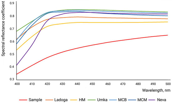 The human eye tends to describe materials with a slightly bluish tint as “whiter”. This is why the compensation of yellowish colors of raw materials with the help of blue colorants or OBAs became a common practice. OBAs absorb the energy of the electromagnetic spectrum in the invisible ultraviolet region and emit it in the visible range of 430–470 nm. As a result, the material appears slightly bluish [26]. Usually, the manufacturer does not indicate whether OBAs have been used in the paperboard composition. This can be determined experimentally by measuring the values of the spectral reflectance at the wavelength 400–500 nm. The spectral curves indicate the absence of OBAs in the composition of materials (Figure 2). Neva demonstrates the sharpest rise at 410–430 nm; however, this sample has the lowest whiteness index in its group (Table 3). The shape of the curves of the other paperboards is smoother; they repeat the pattern of the laboratory sample, though they demonstrate a higher spectral reflectance coefficient.