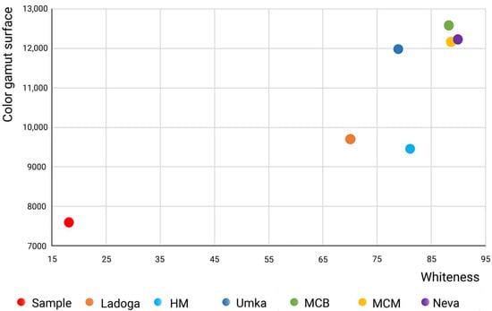 As mentioned above, the color gamut of any material depends on the whiteness, as clearly visible in Figure 4, where the areas of the color gamut for each paperboard were matched to its CIE whiteness index. The color gamuts of the samples increase with the improving whiteness values of the paperboards, with the best results corresponding to the coated materials. Neva steps out of the trend, which is explained by the coarse fiber composition and the initially low values of whiteness and smoothness. Consequently, the coated ply emphasizes the texture of the fibers and does not provide proper whiteness. The uncoated paperboard samples (NM, Ladoga) have lower whiteness values, and therefore a smaller color gamut. On the other hand, for samples with bleached fibers in the top ply, it is much higher than for a laboratory sample obtained from 100% wastepaper.