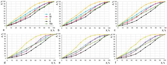 TVI curves for a laboratory Sample (a); uncoated paperboards Ladoga (b) and NM (c); and coated paperboards Umka (d), MCB (e), and Neva (f). Axes: X—tone value in file; A—total dot area in imprint.