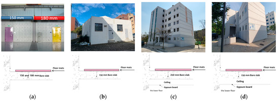 A total of four test beds were employed, as shown in Figure 3. As shown in Figure 3a, test bed A is a box-type experimental building with a wall-type concrete structure. It was divided into two rectangular rooms, and the impact sound reduction performance was measured for each floor structure due to the different slab thicknesses. The sound source room of test bed A was exposed to the outside. The floors structures were a bare slab with a thickness of 150 mm and a bare slab with a thickness of 180 mm for left and right rooms, respectively. Figure 3b shows test bed B, which was originally designed as an up-and-downside coupled reverberation chamber. In test bed B, an acoustic chamber was designed at the downside, and the floor was composed of a bare slab of 150 mm. Test beds C and D, as shown in Figure 3c and Figure 3d, respectively, were constructed as standard apartment buildings to reflect real-life style floor plans and evaluate floor impact sound performances [3]. The floor structure of test bed C had a bare slab with a thickness of 210 mm as a wall-type concrete structure, as shown in Figure 3c. However, the floor structure of test bed D had a bare slab with a thickness of 150 mm as a Rahmen-type beam–column concrete structure, as shown in Figure 3d. All four test beds are test facilities that meet the requirements of KS F 2865 [36].