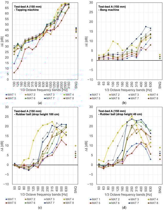 Frequency characteristics of floor impact sound reduction levels for each mat sample in the 150 mm thick room of test bed A. (a) Tapping machine; (b) bang machine; (c) rubber ball (drop height of 1 m); (d) rubber ball (drop height of 0.4 m).