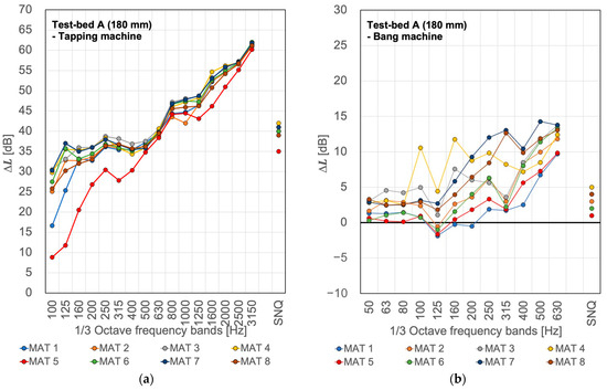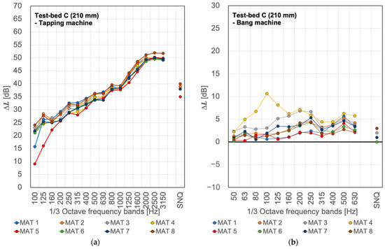 Figure 4 shows the impact sound reduction performance results for the bare slab with a thickness of 150 mm in test bed A (shown in Figure 3a). The test room consisted of two floor structures with a total of eight floor mat samples. It was found that sufficient impact sound reduction was achieved for light-weight impact sound, regardless of the type of floor mat used. We found that the reduction amount by frequency band increased as the reduction amount went to the high frequency band. For a single-number quantity, a reduction amount of up to 38 dB and a reduction amount of up to 47 dB or more was secured. The impact sound reduction was similar to a certain frequency band for the bang machine, but the impact sound reduction performance increased somewhat from 315 Hz and above. In the case of a single-number quantity, the impact sound reduction performance ranged from 1 dB to 3 dB and from 4 dB to 10 dB, respectively. Figure 4c shows the reduction performance of the floor mat samples for a rubber ball drop height of 1 m. The reduction amount by frequency band indicates that the impact sound is amplified from the 50 Hz band to the 100 Hz band when some floor mats are installed. However, the impact sound reduction performance increased as the frequency band increased from 125 Hz and above. Figure 4d shows the impact sound reduction performance of the floor mat for a rubber ball drop height of 0.4 m, simulating a child’s behavior. The impact sound reduction performance across frequency bands exhibited a similar reduction pattern to that of the rubber ball drop height of 1 m. A single-number quantity can achieve a minimum of 3 dB and a maximum of 9 dB of impact sound reduction.