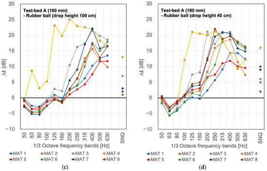 Frequency characteristics of floor impact sound reduction levels for each mat sample in the 180 mm thick room of test bed A. (a) Tapping machine; (b) bang machine; (c) rubber ball (drop height of 1 m); (d) rubber ball (drop height of 0.4 m).