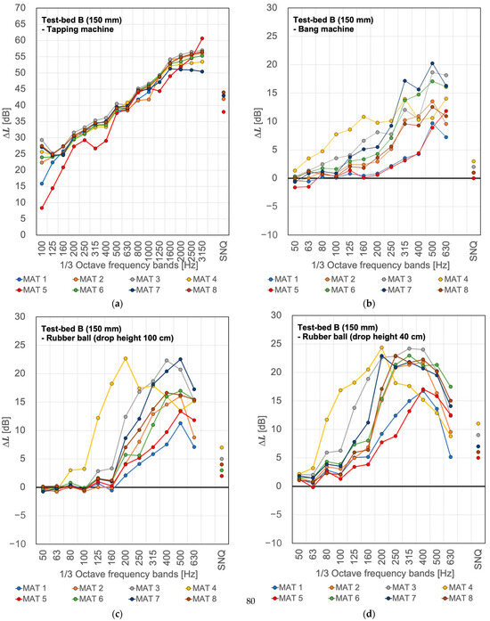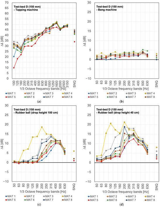 Frequency characteristics of floor impact sound reduction levels for each mat sample in the 150 mm thick room of test bed D. (a) Tapping machine; (b) bang machine; (c) rubber ball (drop height of 1 m); (d) rubber ball (drop height of 0.4 m).