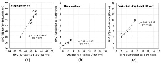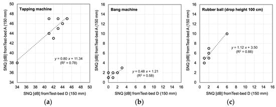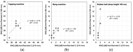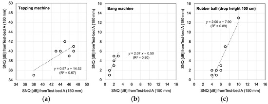 A correlation analysis was conducted on the SNQs of the impact sound reduction performances evaluated on bare slabs with thicknesses of 150 mm and 180 mm in test bed A. The correlation analysis was conducted on the reduction performance. The results of the correlation analysis are shown in Figure 12. As shown in Figure 12a, the correlation analysis of SNQs with light-weight impact sound reduction performance was high, with a correlation of R2 = 0.67 (y = 0.57x − 14.52) being recorded. The correlation of the data obtained from the two test beds when using the bang machine was R2 = 0.80 (y = 2.07x − 0.50), as shown in Figure 12b, and the correlation of the data obtained when using the rubber ball was R2 = 0.89 (y = 2.00x − 7.90), as shown in Figure 12c. Based on the results of the analysis, the evaluated values of light-weight impact sound and heavy-weight impact sound reduction performance in test bed A when bare slab thicknesses of 150 mm and 180 mm were used are reliable in terms of impact sound reduction.