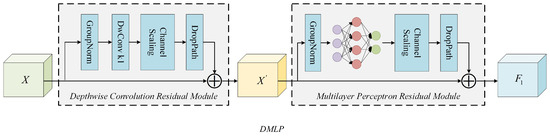 The DMLP consists of a depthwise convolution residual module and a multilayer perceptron residual module, as shown in Figure 7. Depthwise convolution [46] has fewer computational parameters and more efficiency compared to normal convolution. MLP [39] can achieve global information processing. Both modules use residual structures, which help to prevent information loss during information processing. DMLP can detect dense objects by sufficiently integrating global features. The entire process is expressed in Equation (11):