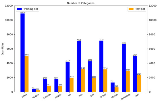 Text block content and its spatial coordinates within the images are labeled by DBNet++ [14], while text recognition is facilitated by CRNN [15]. For key information extraction, 11 entity categories are denoted, including the test unit, the full Chinese name of the test item, the test result, reference range, hint information, etc. The number of categories presented in the training and test labels is counted in Figure 9. Due to the complexity and variety of entities in the patient identification table header (application department, clinical diagnosis, specimen type, etc.), the key–value is adopted for annotation. The key is defined as a question, and its corresponding value is defined as the answer entity, with all remaining information categorized as Other. The final result is that each piece of information on the MER image exists in the form of a dictionary. Each message contains “transcription”, “label”, “points”, “id”, and “linking” segments. Specifically, the “points” segment corresponds to the coordinates , and the value of the “linking” segment is [question id, answer id]. If no key–value information is present, the “linking” remains empty. Moreover, this paper labels the “Body” with the smallest bounding rectangular box that encompasses all the entities in each row, and employs its position as the training label for the associated entity detection. The 657 images from CMERD are randomly divided into a training set (70%) and a test set (30%). A visual representation of some results is provided in Figure 10. An example of a MER document image with annotations and an explanation is shown in Figure 11.