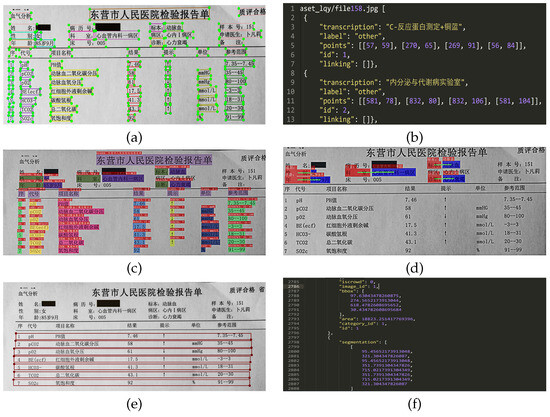 Some results of Chinese medical examination report dataset (CMERD) annotations; (a) is the annotated medical examination repor (MER) image sample; (b) is the label sample of the MER image; (c) denotes semantic entity recognition (SER) label results; (d) denotes relationship extraction (RE) label results; (e) is the sample of the minimum bounding rectangular box for each row of entities for additional annotations; (f) denotes a sample of associated entity detection training labels.