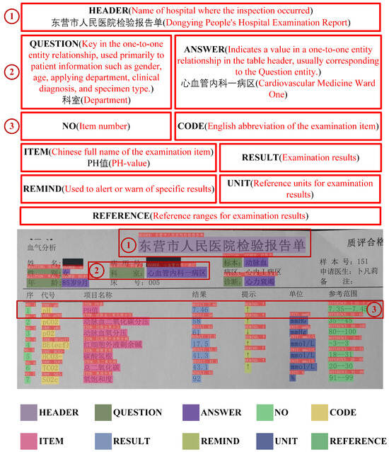 With the advancement of digital transformation, the push for digitizing paper-based documents and reports is ever-increasing, especially in sectors such as healthcare, insurance, and finance [1,2,3]. In this context, the medical examination report (MER) stands out. MER, serving as an important type of medical document, encapsulates crucial information such as patient demographics, doctor’s advice, test items, and results. This is important for guiding medical decision-making. As such, the transition of the MER to an electronic format has great practical value. The purpose of this study is to explore and enable the effective conversion of MER document images into digital formats, which can improve the accessibility of healthcare information, facilitate information exchange, support healthcare decision-making, and facilitate the modernization process of healthcare and related industries.