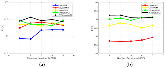 Comparison of F1 results obtained through 5-fold cross-validation on CMERD for different KIE models; (a) is the comparison of F1 results obtained through 5-fold cross-validation for the SER task; (b) is the comparison of F1 results obtained through 5-fold cross-validation for the RE task.