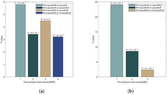Results of the two-sample t-test for F1 scores obtained through 5-fold cross-validation on the CMERD dataset for different KIE models; (a) results of the two-sample t-test for the SER task; (b) results of the two-sample t-test for the RE task.
