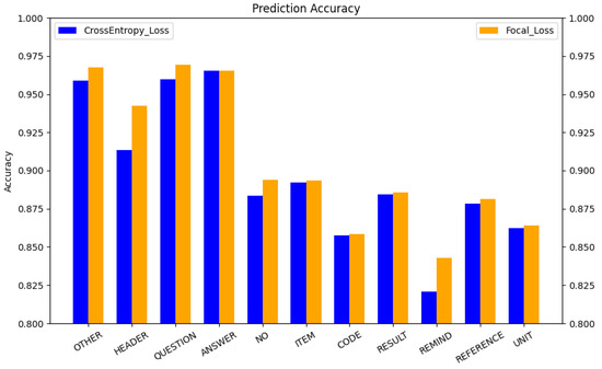 To evaluate the visual modality in CMERD, this paper attaches image modality to the RVI-LayoutXLM. As depicted in Figure 9, the sample count for the “other” category surpasses that of the “header” by a factor of 25. This significant category imbalance hinders the recognition accuracy of less prevalent categories. To solve this problem, we replace the cross-entropy loss [47] of the SER with focal loss [48]. Specifically, focal loss introduces a modulation factor that builds upon the standard cross-entropy loss function, expressed through the following formula: