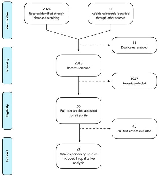 The initial screening of electronic databases yielded a total of 2024 articles and 11 publications identified through a manual search. Duplicated studies were eliminated, leaving 2013 articles for further examination. After reviewing the titles and abstracts of the remaining articles, 66 were chosen for full-text evaluation. Of these, 45 articles were excluded for failure to report clear periodontal outcomes, had insufficient sample sizes of less than 10 patients, and/or involved duplicate patient samples from other studies (Supplemental Table S1). Finally, 21 studies met the inclusion/exclusion criteria and were assessed in this systematic review, as shown in the PRISMA flowchart in Figure 1.
